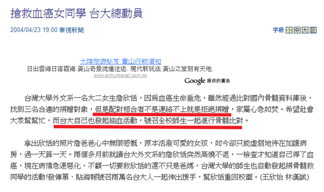 而在稍後的2004年,台大外文系的詹欣恬同學因急性血癌病情加劇,需要骨髓移植,雖然傳出找到配對的骨髓,但卻無法進行順利進行移植。